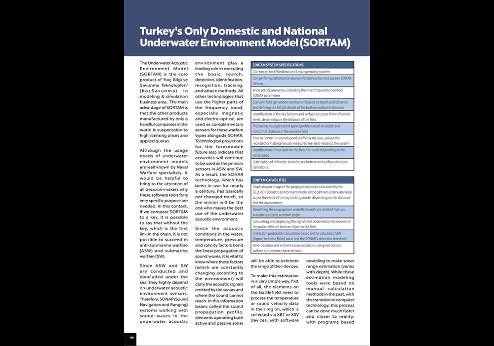 The Underwater Acoustic Environment Model (SORTAM) is the core product of ‘Koç Bilgi ve Savunma Teknolojileri’ (KoçSavunma) in modeling & simulation business area.. The main advantage of SORTAM is that the other products manufactured by only a handful companies in the world is suspectable to high licensing prices and applied quotas.